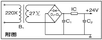 变压器次级选用20W以上输出27V~35V 0.8A左右为好,也可使用普通放大器内的变压器。D1-D4用IN4007,C1=1000μf/50V,C2=1000uf/35V,IC用7824型。